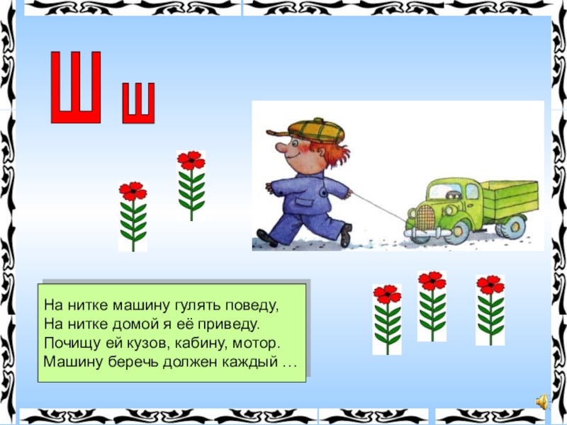 шШНа нитке машину гулять поведу,На нитке домой я её приведу.Почищу ей кузов, кабину, мотор.Машину беречь должен каждый
