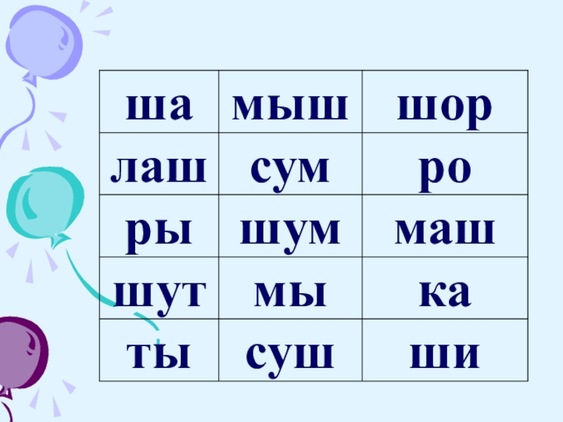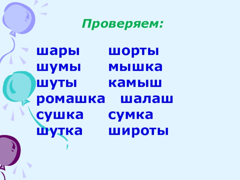 Проверяем:шары			шортышумы			мышкашуты			камышромашка		шалашсушка			сумкашутка			широты