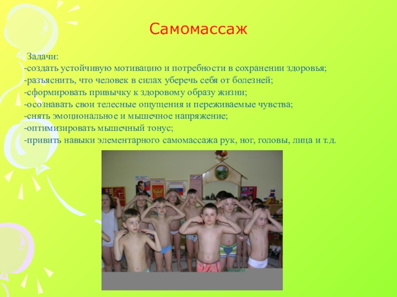 привить навыки элементарного самомассажа рук, ног, головы, лица и т.д.