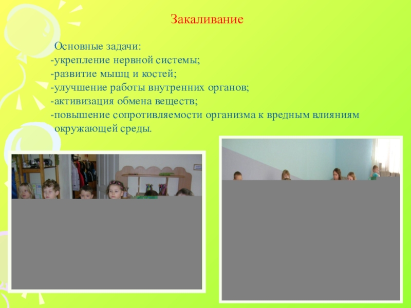 - развитие физических качеств и обеспечение нормального уровня физической подготовленности в соответствии с возможностями и состоянием здоровья ребенка;