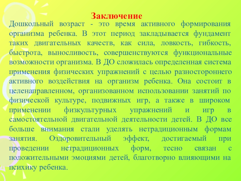 период закладывается фундамент таких двигательных качеств, как сила, ловкость, гибкость, быстрота, выносливость, совершенствуются функциональные возможности организма. В ДО сложилась определенная система применения физических упражнений с целью разностороннего активного воздействия на организм ребенка. Она состоит в целенаправленном, организованном использовании занятий по физической культуре, подвижных игр, а также в широком применении физкультурных упражнений и игр в самостоятельной двигательной деятельности детей. В ДО все больше внимания стали уделять нетрадиционным формам занятия. Оздоровительный эффект, достигаемый при проведении нетрадиционных форм, тесно связан с положительными эмоциями детей, благотворно влияющими на психику ребенка.