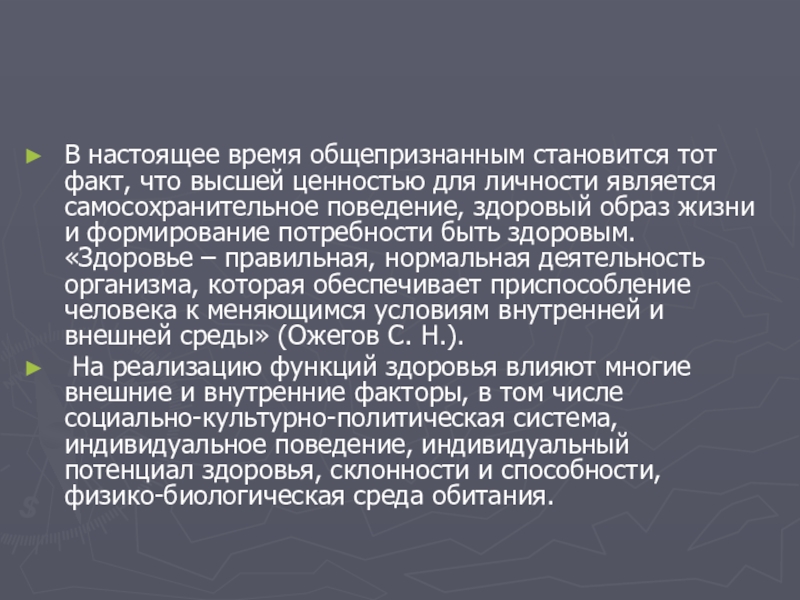 В настоящее время общепризнанным становится тот факт, что высшей ценностью для личности является самосохранительное поведение, здоровый образ