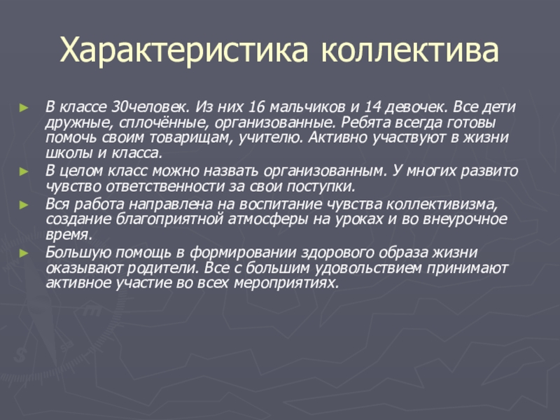 Характеристика коллективаВ классе 30человек. Из них 16 мальчиков и 14 девочек. Все дети дружные, сплочённые, организованные. Ребята