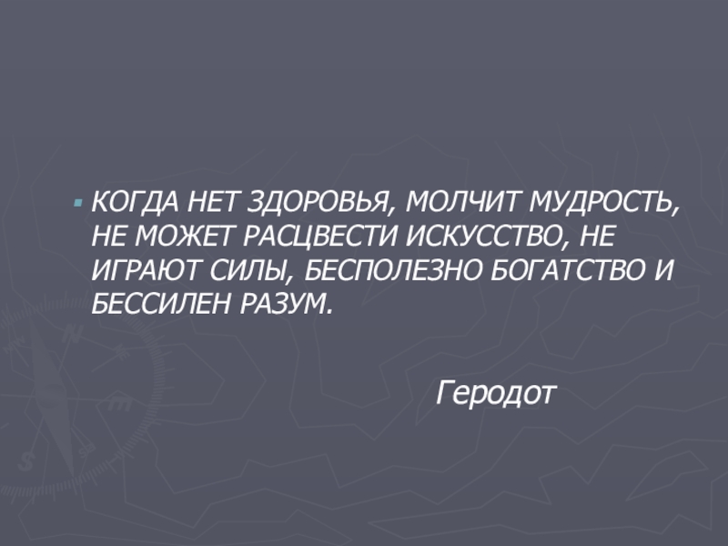 Слайд 3КОГДА НЕТ ЗДОРОВЬЯ, МОЛЧИТ МУДРОСТЬ, НЕ МОЖЕТ РАСЦВЕСТИ ИСКУССТВО, НЕ ИГРАЮТ