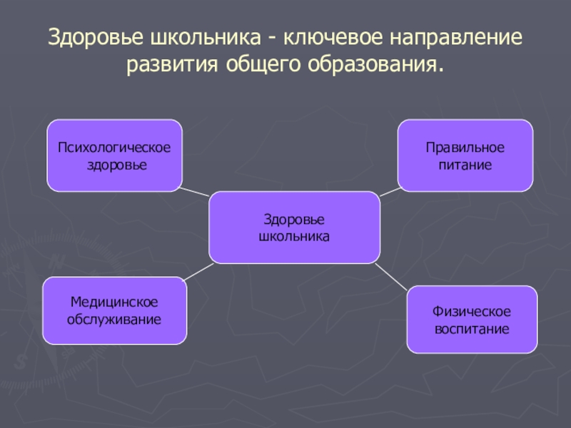 Здоровье школьника - ключевое направление развития общего образования.ЗдоровьешкольникаПравильное питаниеФизическоевоспитаниеПсихологическое здоровьеМедицинскоеобслуживание