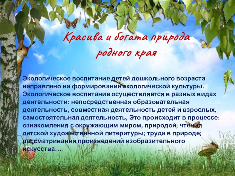 Экологическое воспитание осуществляется в разных видах деятельности: непосредственная образовательная деятельность, совместная деятельность детей и взрослых, самостоятельная деятельность, Это происходит в процессе: ознакомления с окружающим миром, природой; чтения детской художественной литературы; труда в природе; рассматривания произведений изобразительного искусства…