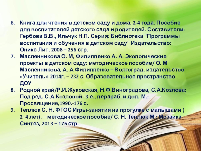Масленникова О. М, Филиппенко А. А. Экологические проекты в детском саду: методическое пособие/ О. М Масленникова, А. А Филиппенко – Волгоград, издательство «Учитель» 2014г. – 232 с. Образовательное пространство ДОУ