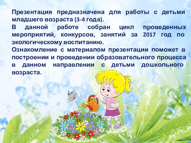 данной работе собран цикл проведенных мероприятий, конкурсов, занятий за 2017 год по экологическому воспитанию.