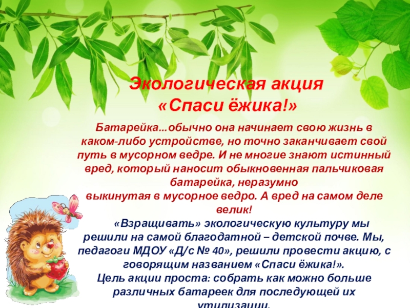 «Взращивать» экологическую культуру мы решили на самой благодатной – детской почве. Мы, педагоги МДОУ «Д/с № 40», решили провести акцию, с говорящим названием «Спаси ёжика!».