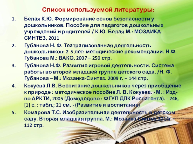 Губанова Н.Ф. Развитие игровой деятельности. Система работы во второй младшей группе детского сада. /Н. Ф. Губанова – М.: Мозаика-Синтез. 2009 г. – 144 стр.