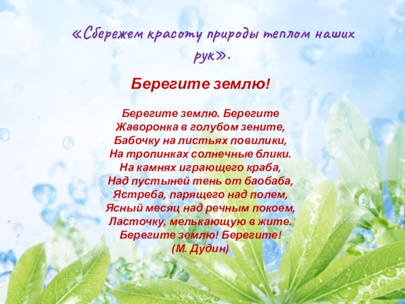 Слайд 40«Сбережем красоту природы теплом наших рук».