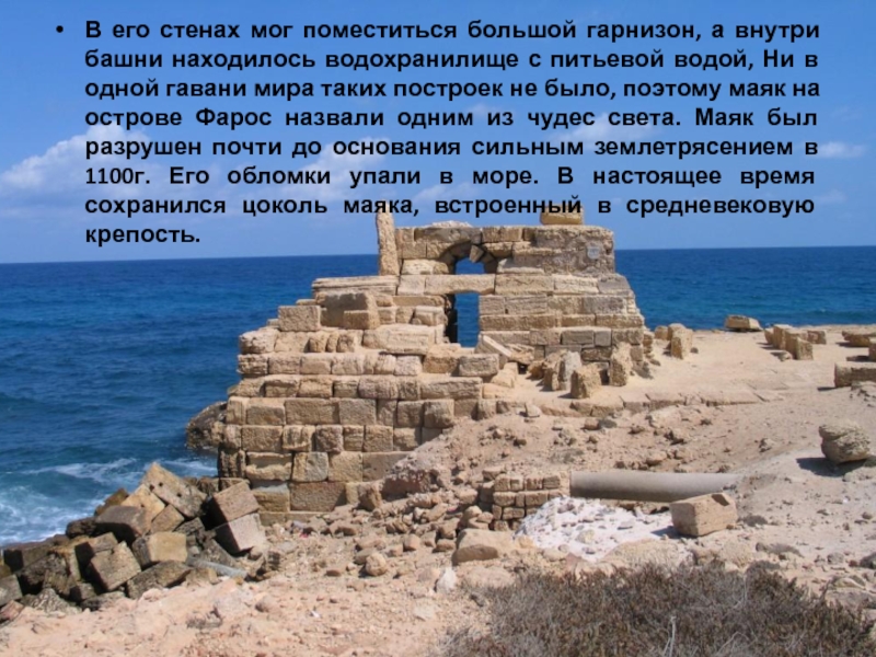 водохранилище с питьевой водой, Ни в одной гавани мира таких построек не было, поэтому маяк на острове Фарос назвали одним из чудес света. Маяк был разрушен почти до основания сильным землетрясением в 1100г. Его обломки упали в море. В настоящее время сохранился цоколь маяка, встроенный в средневековую крепость.