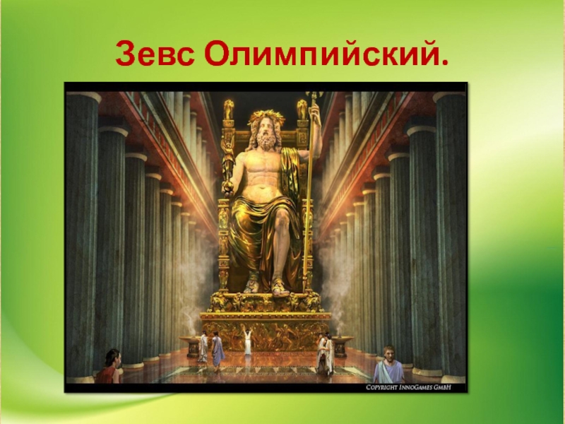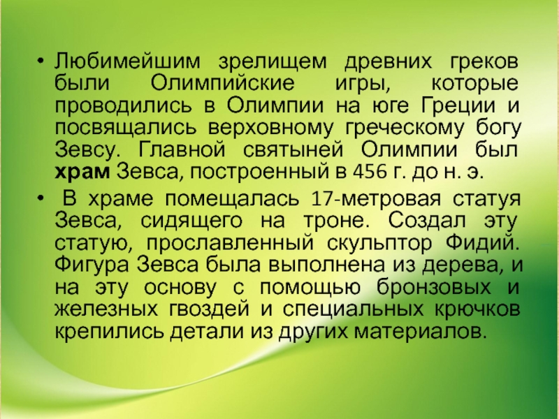 на юге Греции и посвящались верховному греческому богу Зевсу. Главной святыней Олимпии был храм Зевса, построенный в 456 г. до н. э.