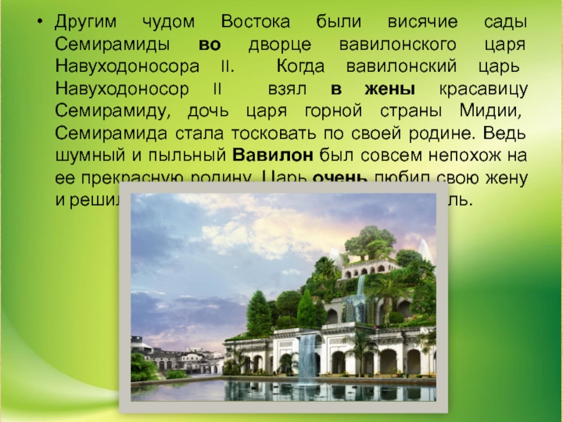 Навуходоносора II. Когда вавилонский царь Навуходоносор II взял в жены красавицу Семирамиду, дочь царя горной страны Мидии, Семирамида стала тосковать по своей родине. Ведь шумный и пыльный Вавилон был совсем непохож на ее прекрасную родину. Царь очень любил свою жену и решил сделать все, чтобы развеять её печаль.
