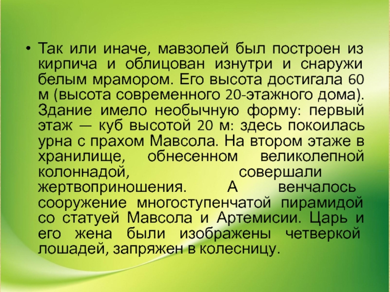 и снаружи белым мрамором. Его высота достигала 60 м (высота современного 20-этажного дома). Здание имело необычную форму: первый этаж — куб высотой 20 м: здесь покоилась урна с прахом Мавсола. На втором этаже в хранилище, обнесенном великолепной колоннадой, совершали жертвоприношения. А венчалось сооружение многоступенчатой пирамидой со статуей Мавсола и Артемисии. Царь и его жена были изображены четверкой лошадей, запряжен в колесницу.