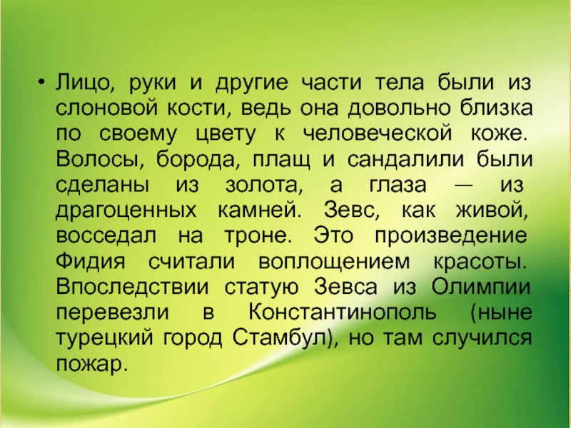 она довольно близка по своему цвету к человеческой коже. Волосы, борода, плащ и сандалили были сделаны из золота, а глаза — из драгоценных камней. Зевс, как живой, восседал на троне. Это произведение Фидия считали воплощением красоты. Впоследствии статую Зевса из Олимпии перевезли в Константинополь (ныне турецкий город Стамбул), но там случился пожар.