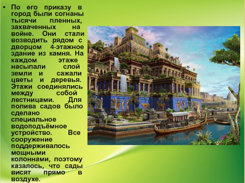 войне. Они стали возводить рядом с дворцом 4-этажное здание из камня. На каждом этаже насыпали слой земли и сажали цветы и деревья. Этажи соединялись между собой лестницами. Для полива садов было сделано специальное водоподъёмное устройство. Все сооружение поддерживалось мощными колоннами, поэтому казалось, что сады висят прямо в воздухе.