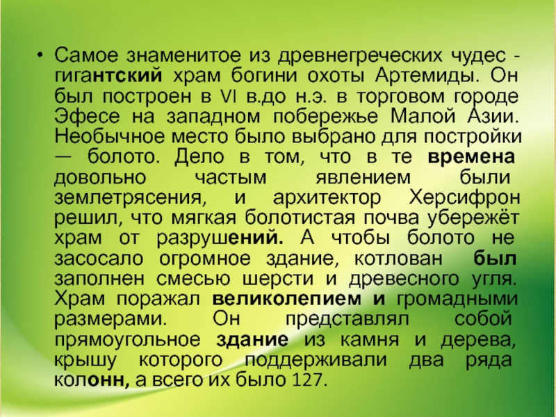 Слайд 23Самое знаменитое из древнегреческих чудес - гигантский храм богини охоты Артемиды.