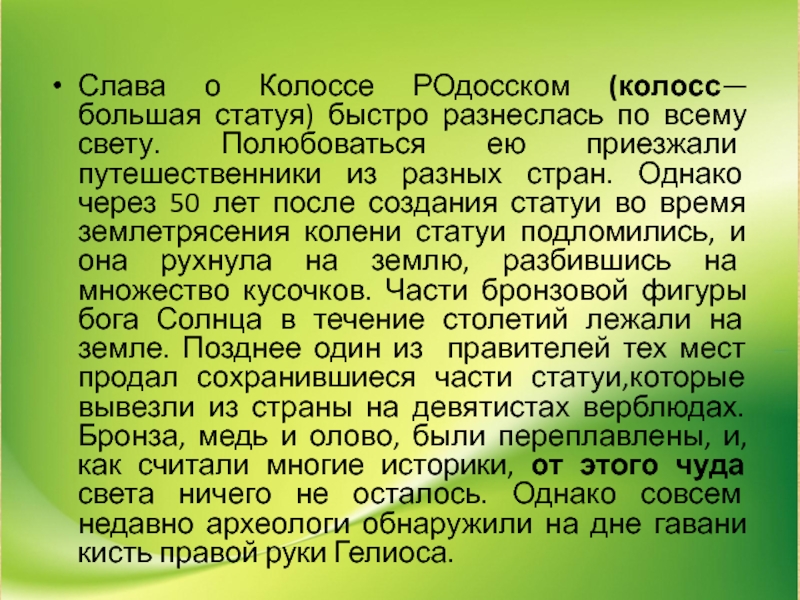 свету. Полюбоваться ею приезжали путешественники из разных стран. Однако через 50 лет после создания статуи во время землетрясения колени статуи подломились, и она рухнула на землю, разбившись на множество кусочков. Части бронзовой фигуры бога Солнца в течение столетий лежали на земле. Позднее один из правителей тех мест продал сохранившиеся части статуи,которые вывезли из страны на девятистах верблюдах. Бронза, медь и олово, были переплавлены, и, как считали многие историки, от этого чуда света ничего не осталось. Однако совсем недавно археологи обнаружили на дне гавани кисть правой руки Гелиоса.