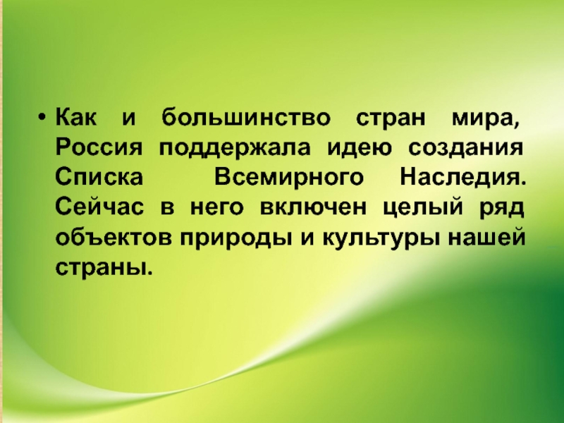 Слайд 30Как и большинство стран мира, Россия поддержала идею создания Списка Всемирного