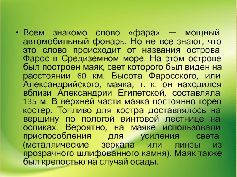 знают, что это слово происходит от названия острова Фарос в Средиземном море. На этом острове был построен маяк, свет которого был виден на расстоянии 60 км. Высота Фаросского, или Александрийского, маяка, т. к. он находился вблизи Александрии Египетской, составляла 135 м. В верхней части маяка постоянно горел костер. Топливо для костра доставлялось на вершину по пологой винтовой лестнице на осликах. Вероятно, на маяке использовали приспособления для усиления света (металлические зеркала или линзы из прозрачного шлифованного камня). Маяк также был крепостью на случай осады.
