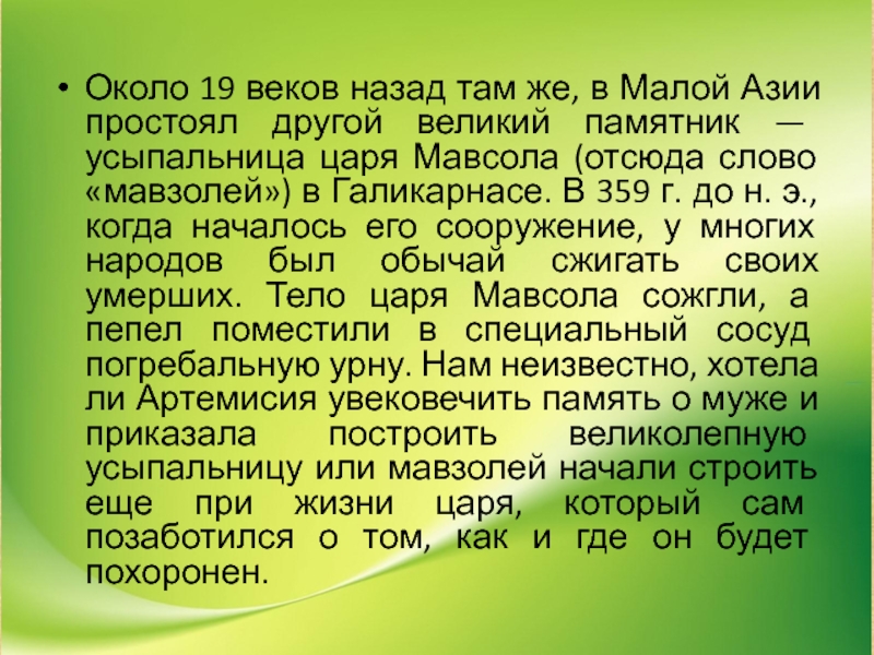великий памятник — усыпальница царя Мавсола (отсюда слово «мавзолей») в Галикарнасе. В 359 г. до н. э., когда началось его сооружение, у многих народов был обычай сжигать своих умерших. Тело царя Мавсола сожгли, а пепел поместили в специальный сосуд погребальную урну. Нам неизвестно, хотела ли Артемисия увековечить память о муже и приказала построить великолепную усыпальницу или мавзолей начали строить еще при жизни царя, который сам позаботился о том, как и где он будет похоронен.