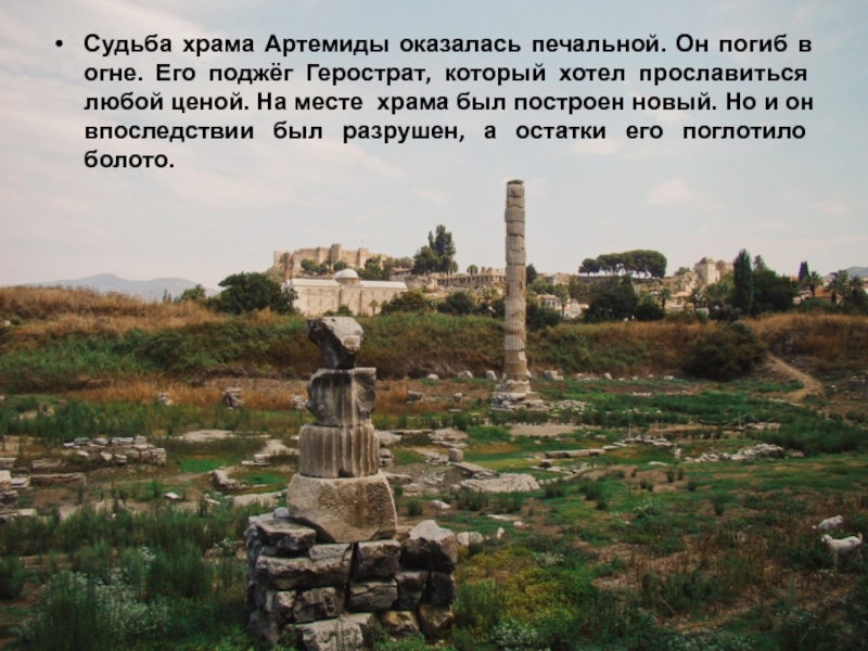 Герострат, который хотел прославиться любой ценой. На месте храма был построен новый. Но и он впоследствии был разрушен, а остатки его поглотило болото.
