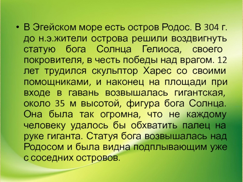 острова решили воздвигнуть статую бога Солнца Гелиоса, своего покровителя, в честь победы над врагом. 12 лет трудился скульптор Харес со своими помощниками, и наконец на площади при входе в гавань возвышалась гигантская, около 35 м высотой, фигура бога Солнца. Она была так огромна, что не каждому человеку удалось бы обхватить палец на руке гиганта. Статуя бога возвышалась над Родосом и была видна подплывающим уже с соседних островов.