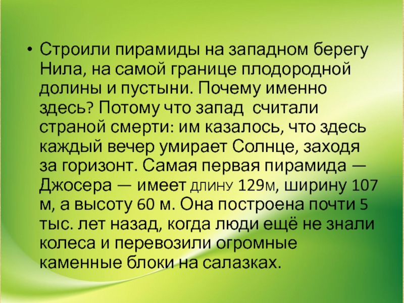 и пустыни. Почему именно здесь? Потому что запад считали страной смерти: им казалось, что здесь каждый вечер умирает Солнце, заходя за горизонт. Самая первая пирамида — Джосера — имеет длину 129м, ширину 107 м, а высоту 60 м. Она построена почти 5 тыс. лет назад, когда люди ещё не знали колеса и перевозили огромные каменные блоки на салазках.