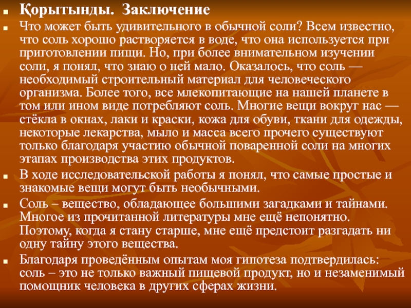 Соль – вещество, обладающее большими загадками и тайнами. Многое из прочитанной литературы мне ещё непонятно. Поэтому, когда я стану старше, мне ещё предстоит разгадать ни одну тайну этого вещества.