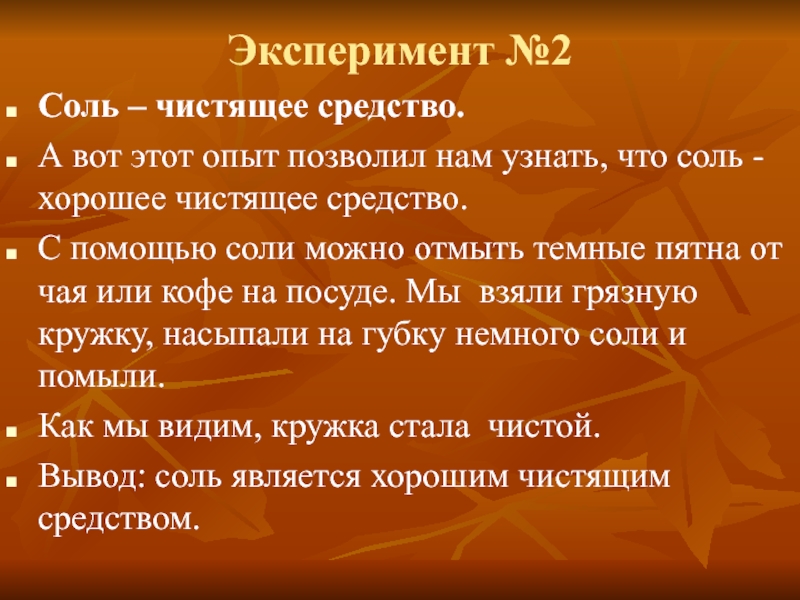 Вывод: соль является хорошим чистящим средством.