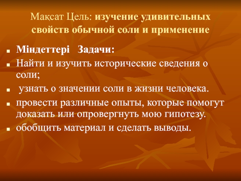 Слайд 2Мақсат Цель: изучение удивительных свойств обычной соли и применение