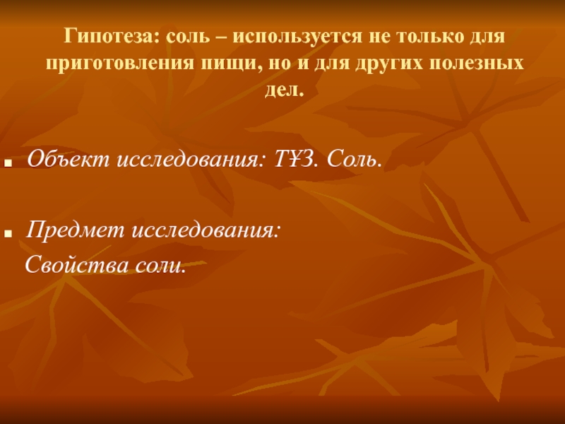 Слайд 3Гипотеза: соль – используется не только для приготовления пищи, но и