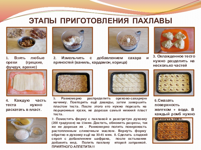 7. Поместить форму с пахлавой в разогретую духовку (200 градусов) на 15мин. Достать, обновить разрезы, так же не дорезая их . Равномерно полить поверхность растопленным сливочным маслом. Вернуть форму обратно в духовку ещё на 30-45 мин. 8. Сделать сладкий сироп с добавлением шафрана, после остывания добавить мед. Полить пахлаву второй заправкой. ПРИЯТНОГО АППЕТИТА!!!