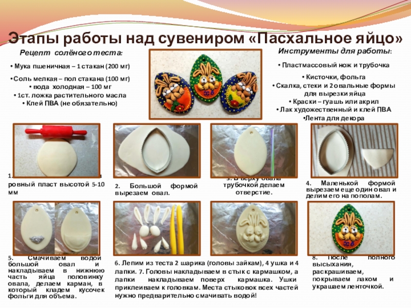 6. Лепим из теста 2 шарика (головы зайкам), 4 ушка и 4 лапки. 7. Головы накладываем в стык с кармашком, а лапки накладываем поверх кармашка. Ушки приклеиваем к головкам. Места стыковок всех частей нужно предварительно смачивать водой!