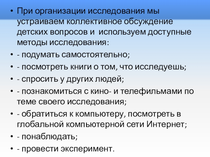 Слайд 22При организации исследования мы устраиваем коллективное обсуждение детских вопросов и используем