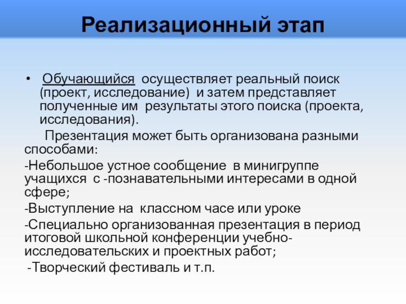Обучающийся осуществляет реальный поиск (проект, исследование) и затем представляет