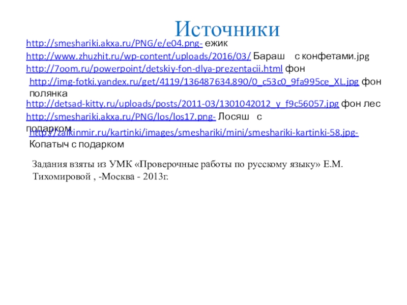 Задания взяты из УМК «Проверочные работы по русскому языку» Е.М.Тихомировой , -Москва - 2013г.