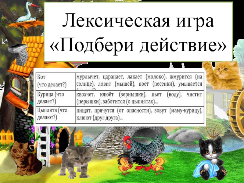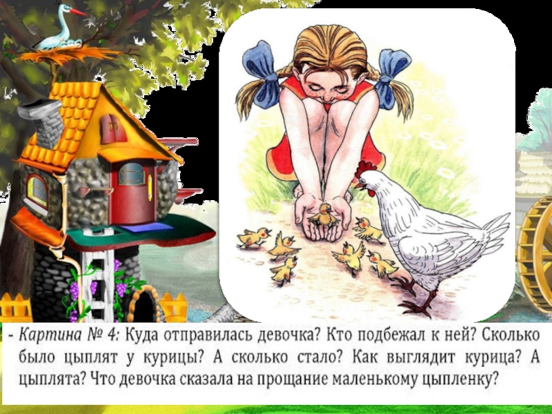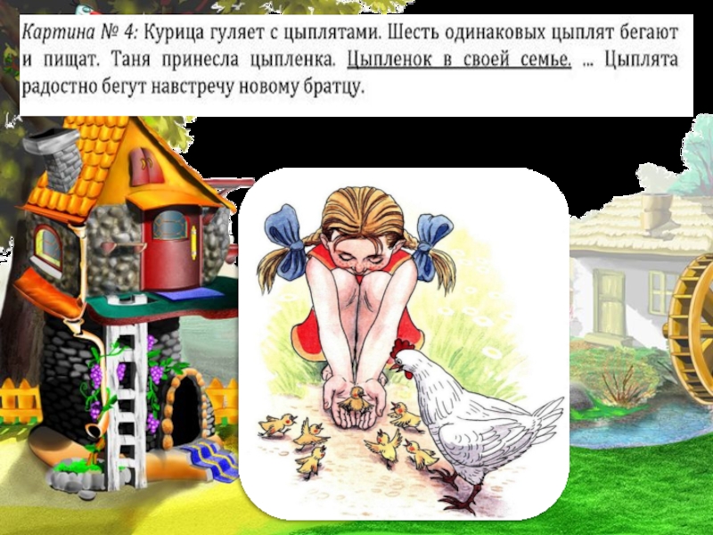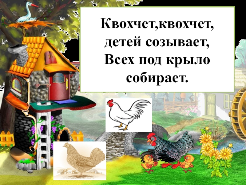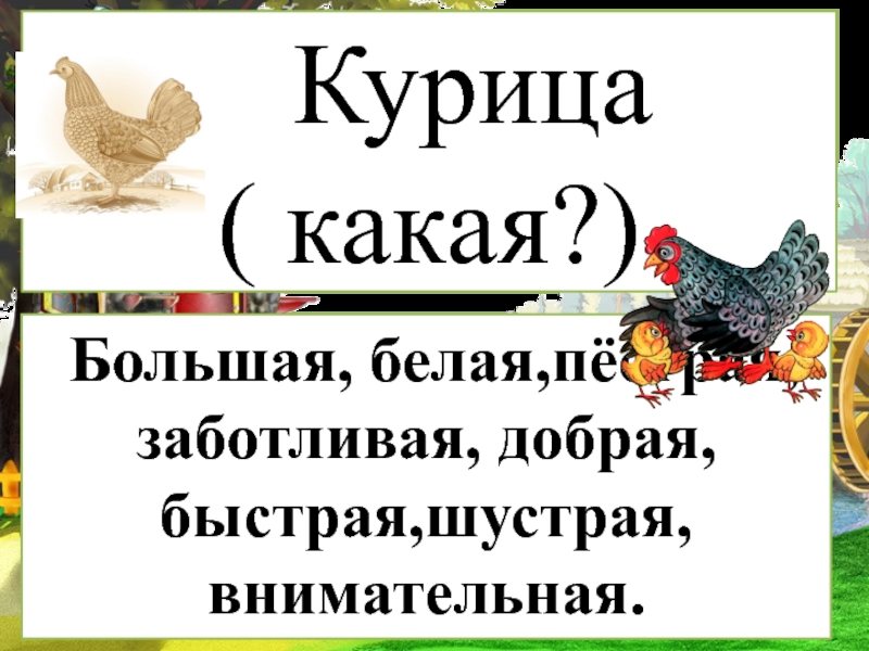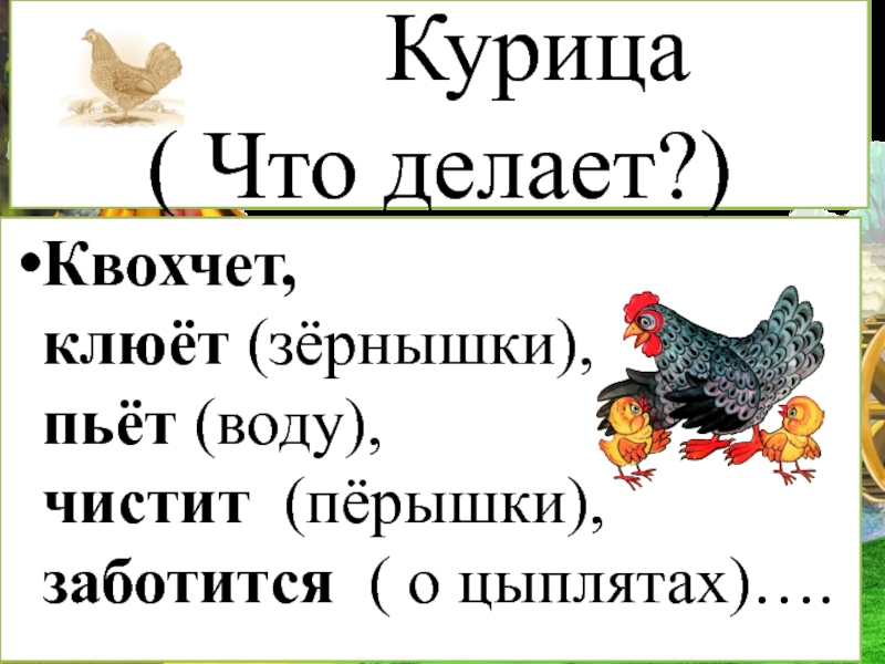 Квохчет, клюёт (зёрнышки), пьёт (воду), чистит (пёрышки), заботится ( о цыплятах)….