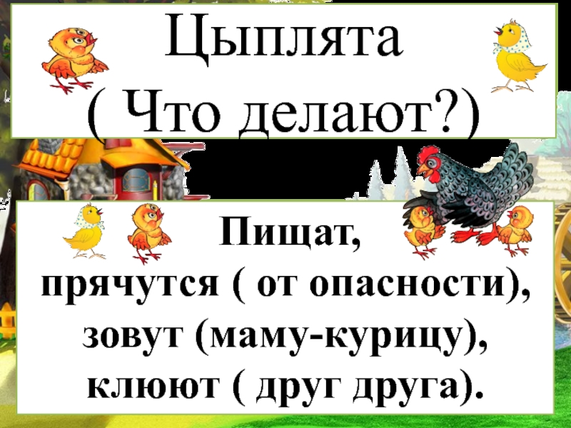 Пищат, прячутся ( от опасности), зовут (маму-курицу), клюют ( друг друга).