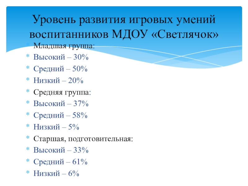 Уровень развития игровых умений воспитанников МДОУ «Светлячок»