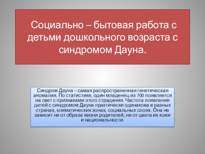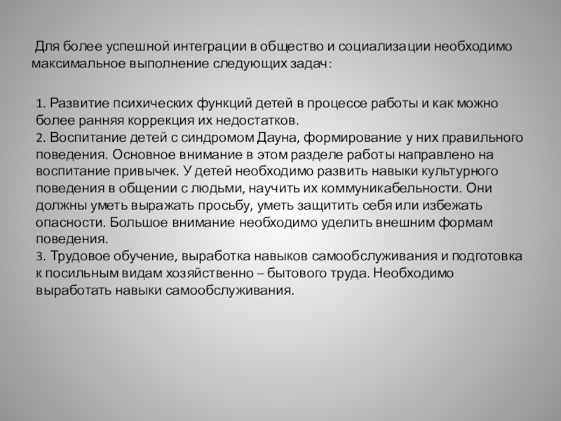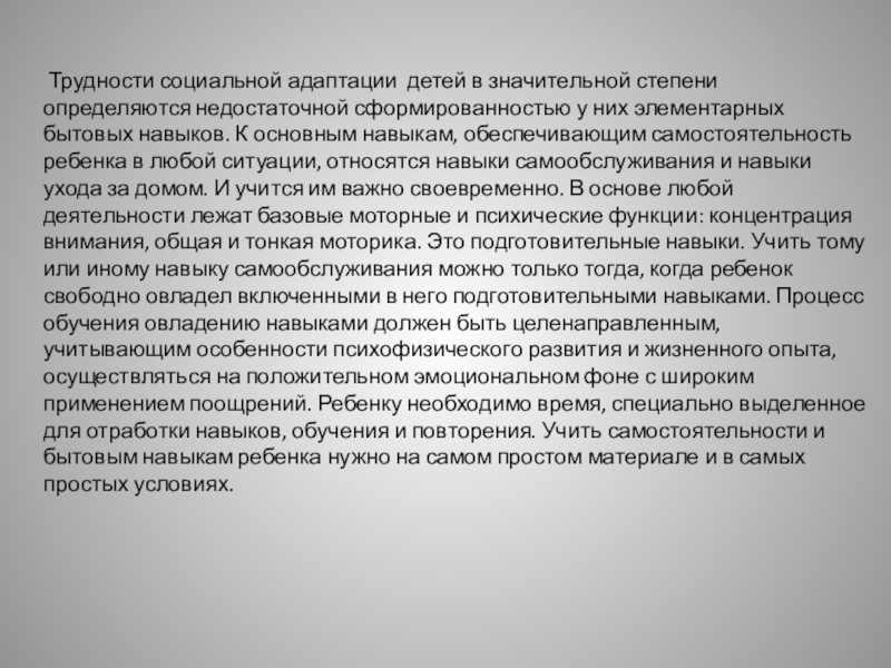 социальная адаптация, приспособление к жизни и возможная интеграция в общество. Необходимо, используя все познавательные способности детей, и, учитывая специфику развития психических процессов, развивать у них жизненно необходимые навыки, чтобы, став взрослыми, они могли самостоятельно себя обслуживать, выполнять в быту простую работу, повысить качество их жизни и жизни их родителей.