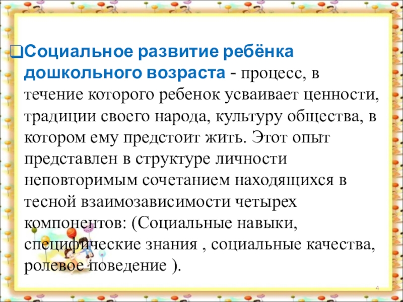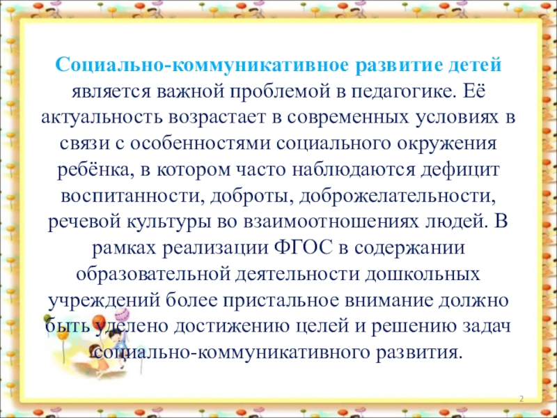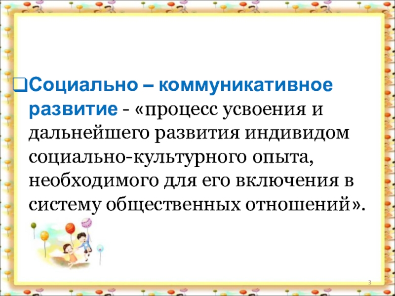 Социально – коммуникативное развитие - «процесс усвоения и дальнейшего развития индивидом социально-культурного опыта, необходимого для его включения в систему общественных отношений».