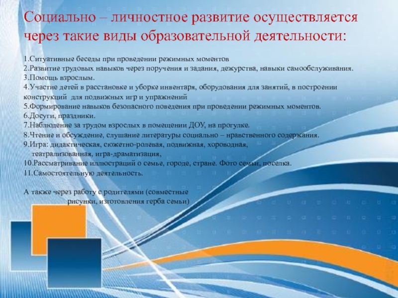 Слайд 15Социально – личностное развитие осуществляется через такие виды образовательной деятельности:
