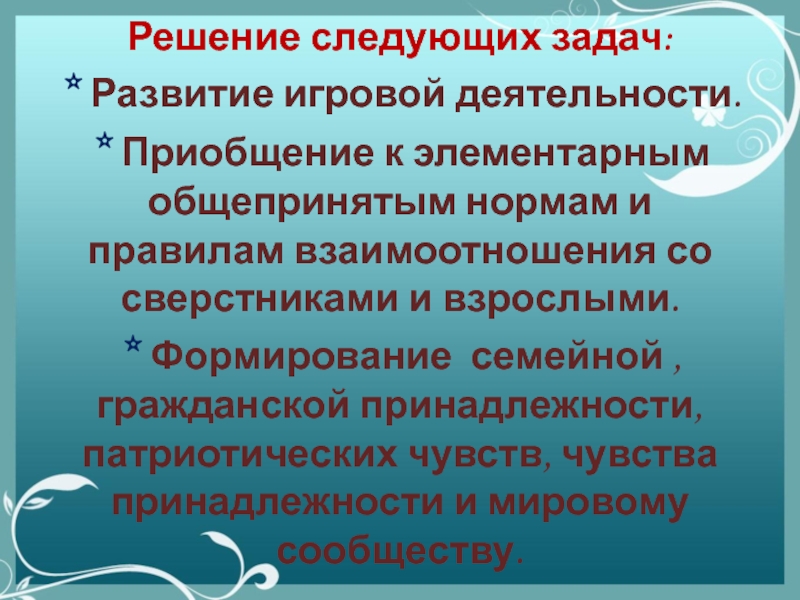 * Формирование семейной , гражданской принадлежности, патриотических чувств, чувства принадлежности и мировому сообществу.