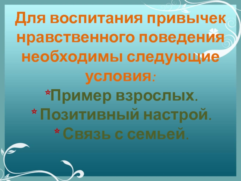 Слайд 9Для воспитания привычек нравственного поведения необходимы следующие условия: