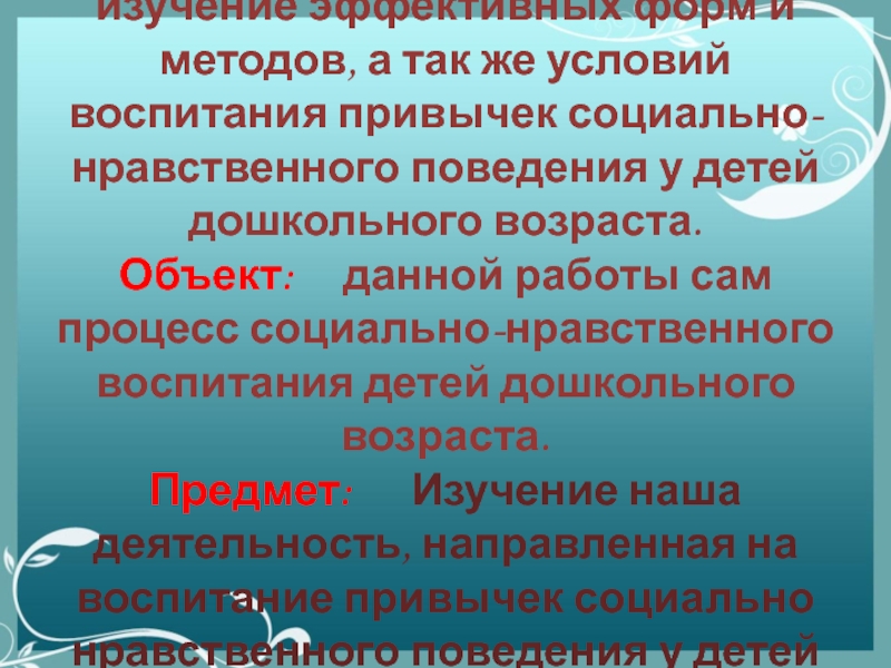 Объект: данной работы сам процесс социально-нравственного воспитания детей дошкольного возраста.