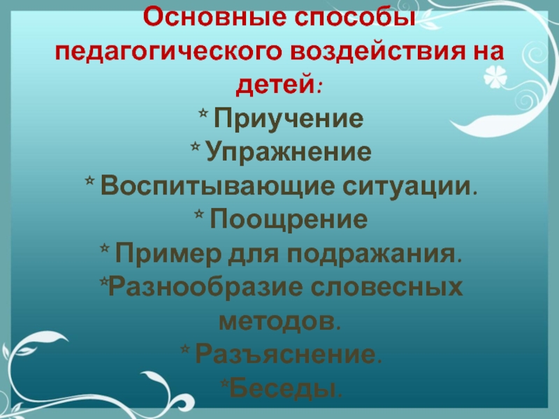 Слайд 10Основные способы педагогического воздействия на детей: