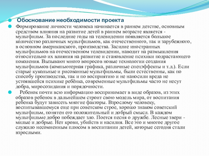 Ребенок почти всю информацию воспринимает в виде образов, из этих образов ребенок в дальнейшем строит свою модель мира, от воспитания ребенка будут зависеть многие факторы. Взрослому человеку, воспитывавшемуся еще при советском строе, хорошо знаком советский мультфильм, понятен его положительный и добрый смысл. В каждом мультфильме добро побеждает зло. Поется песня о дружбе. Лесные звери - милые и добрые. Нет крови, убийств и насилия. Все это и многое другое служило несомненным плюсом в воспитании детей, которые сегодня стали взрослыми.