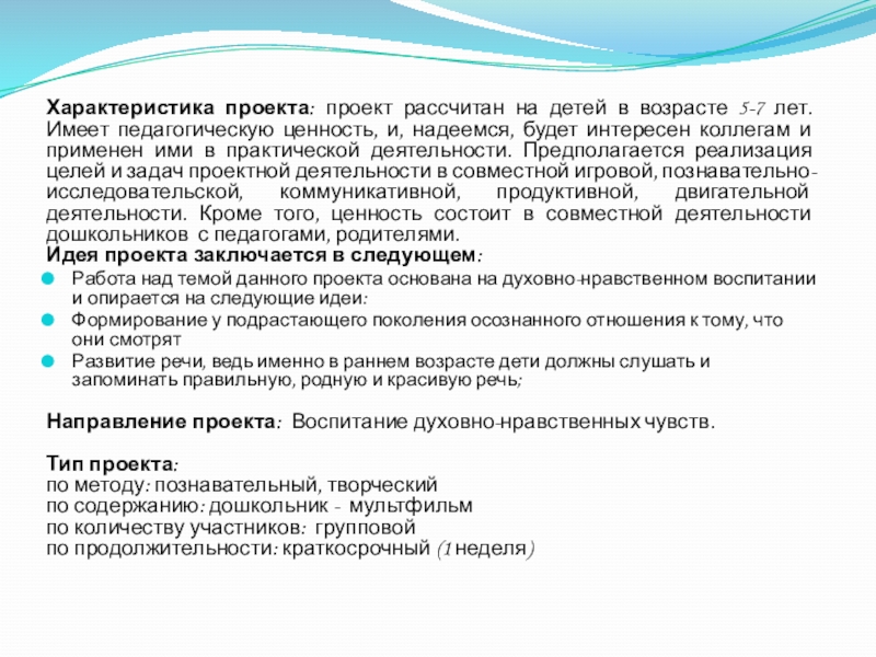 Характеристика проекта: проект рассчитан на детей в возрасте 5-7 лет. Имеет